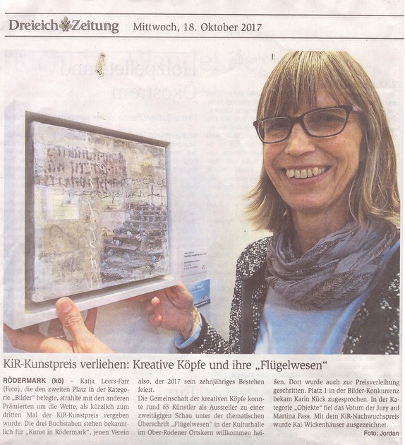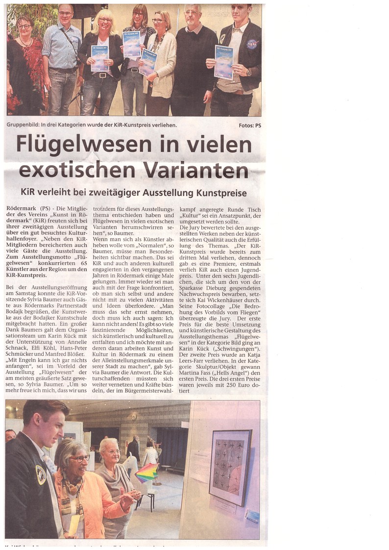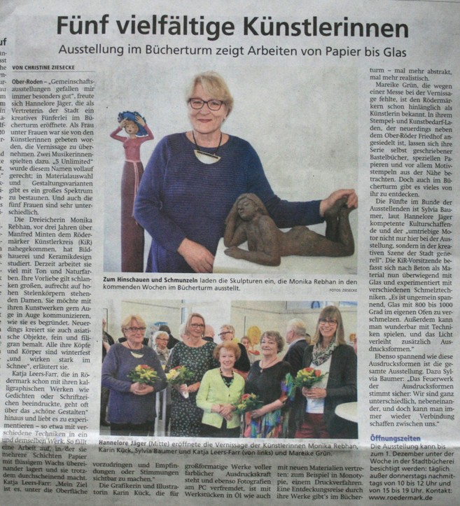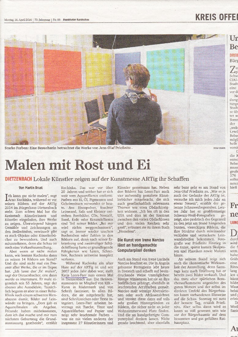 Die Besucher können die Blumen-Fotografien Barbara Jungheinrich-Höhlers betrachten, Anne Vipers Tuschezeichnung eines Musikers und Katja Leers-Farrs Beschäftigung mit der Typographie. Ein Blickfang ist auch Katja Leers-Farrs Arbeit „Tribute to Andy – Visions of a Dog“. Die Bleistiftzeichnung eines Hundes wurde dazu eingescannt und am Computer im Stil des Pop-Art-Künstlers Andy Warhol bearbeitet. ..."